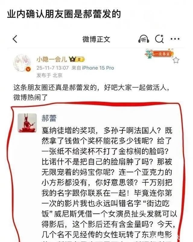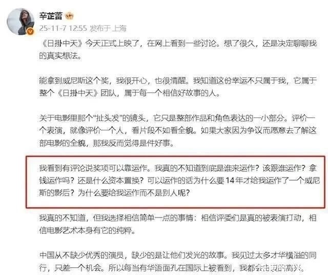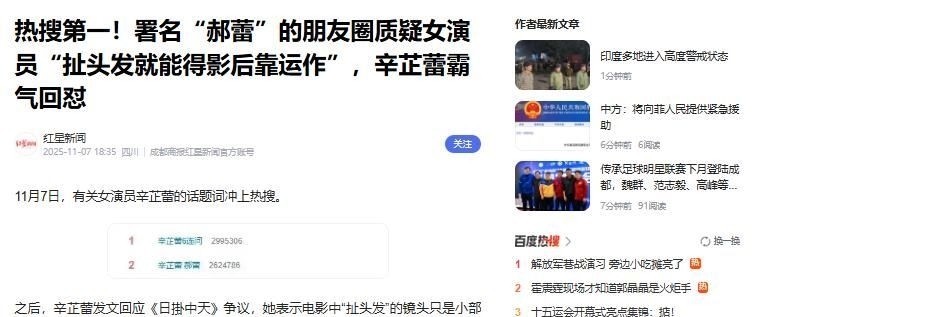 147:热搜第一!署名“郝蕾”的朋友圈质疑女演员“扯头发就能得影后靠运作”,辛芷蕾霸气回怼.红星新闻.2025-11-07