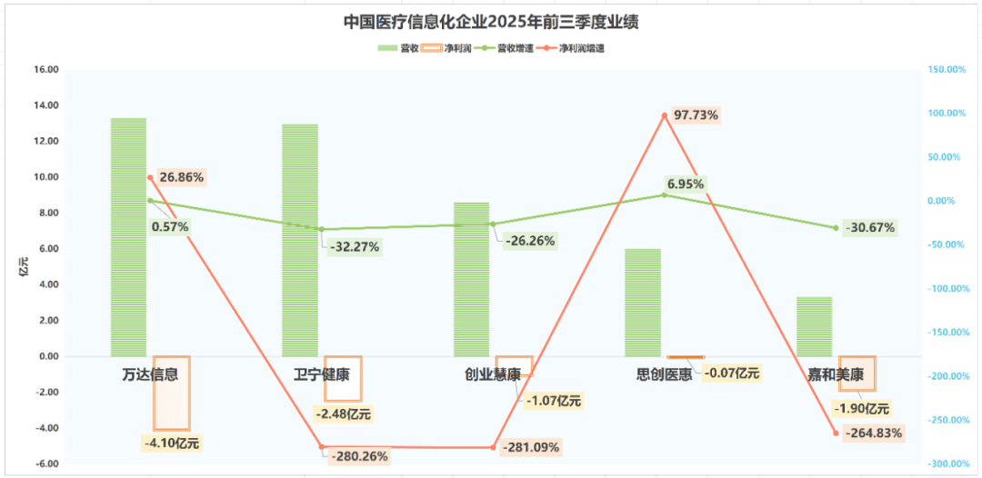 这种市场变化,直接反映在头部企业的业绩报表上——2025年前三季度,主流医疗信息化企业几乎集体亏损,营收增速集体“失速”。
