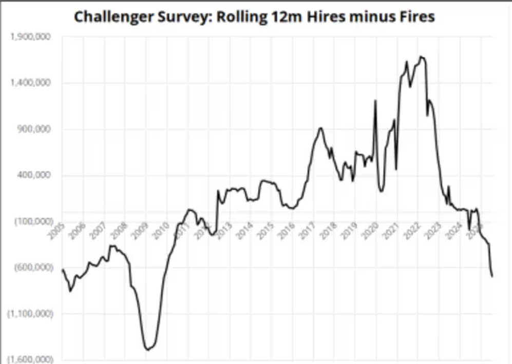 周四的Challenger数据,为近期一系列令人失望的劳动力市场数据再添一笔,而此时投资者已连续第二个月无法获得劳工部的官方就业数据。这似乎加剧了市场长期以来的担忧:股票估值过高、投机领域存在泡沫,以及对人工智能交易热潮持久性的怀疑。