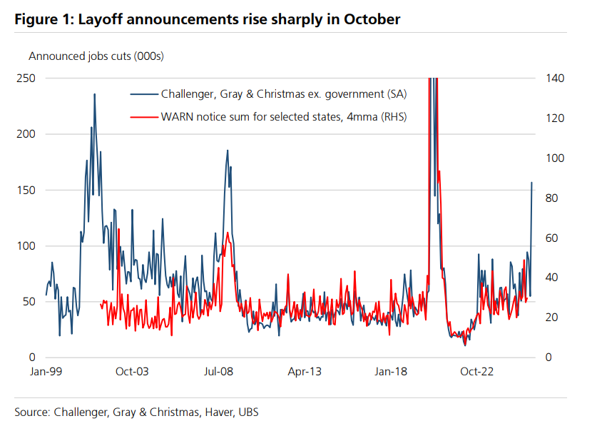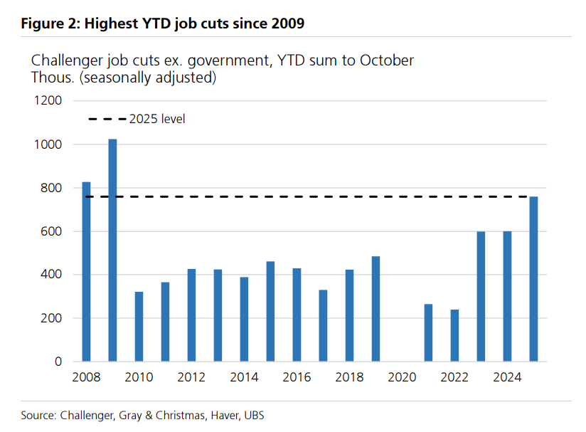 瑞银警告,美国就业市场所谓的“低雇佣、低裁员”叙事正在坍塌,截至10月,今年美国累计裁员人数已创下2009年以来最高纪录。