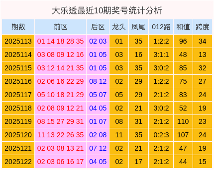 后区分析:在最近5期奖号数据中,后区开出6次小数,4次大数,最近10期奖号数据中,后区大小比为7:13,小数后区走势较强,本期预测开出号码为04,06。